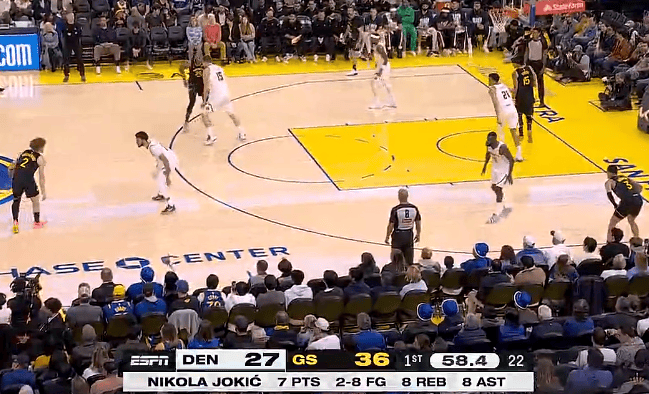 约基奇首节9中2得到7分8篮板8助攻,掘金27-39落后勇士