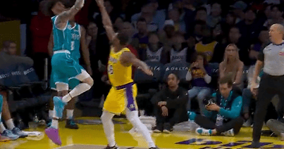 鲍尔单脚起跳底角三分潇洒命中,还剩5分钟黄蜂领先湖人15分
