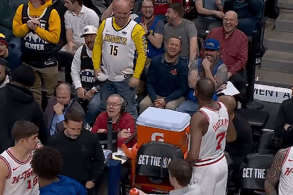杜兰特在裁判回看暂停期间,与掘金主场球迷友好对线