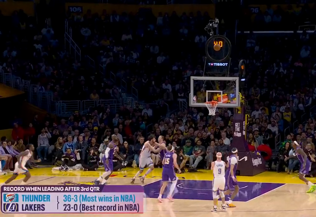 前三节领先时战绩:湖人23-0胜率最高,雷霆36-3胜场最多