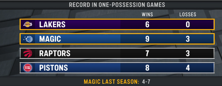 本赛季分差1回合内的战绩:湖人6胜0负第一、魔术9胜3负第二