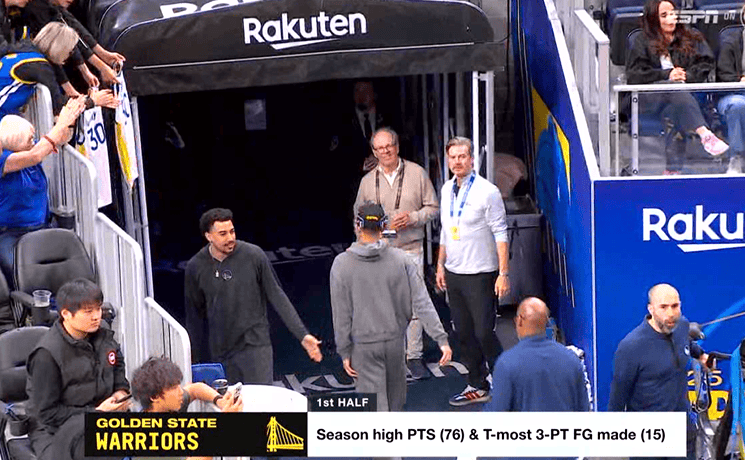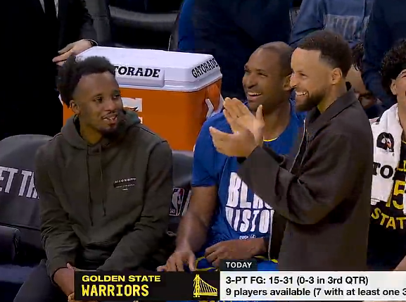 全民皆兵!勇士9人得分7人投进三分,库里场下开心鼓掌庆祝