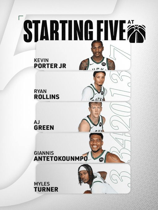 雄鹿首发:阿德托昆博、特纳、罗林斯、AJ-格林、小波特