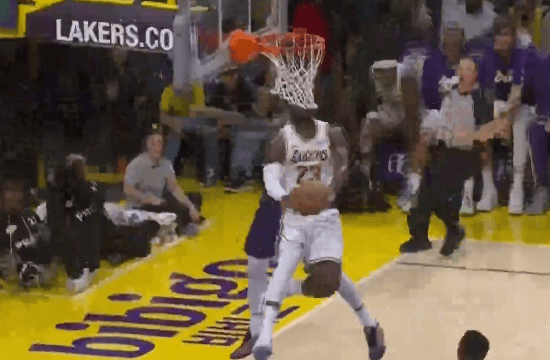 东契奇后场送出长传,詹姆斯接球起飞上演拉杆折叠背扣