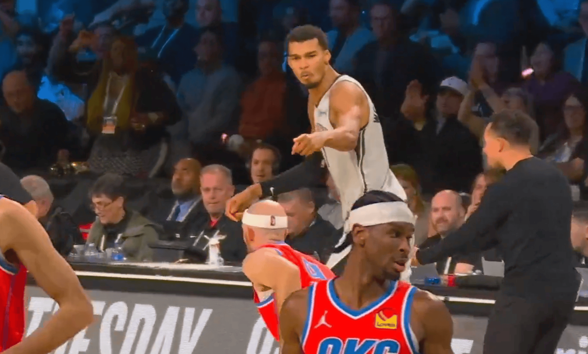顶着卡鲁索翻身投进中投后,文班手指并喊:小废物