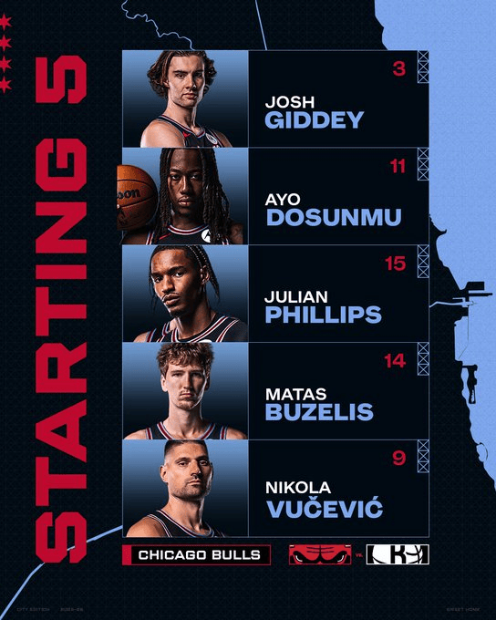 公牛首发:吉迪、多森姆、菲利普斯、布泽利斯、武切维奇