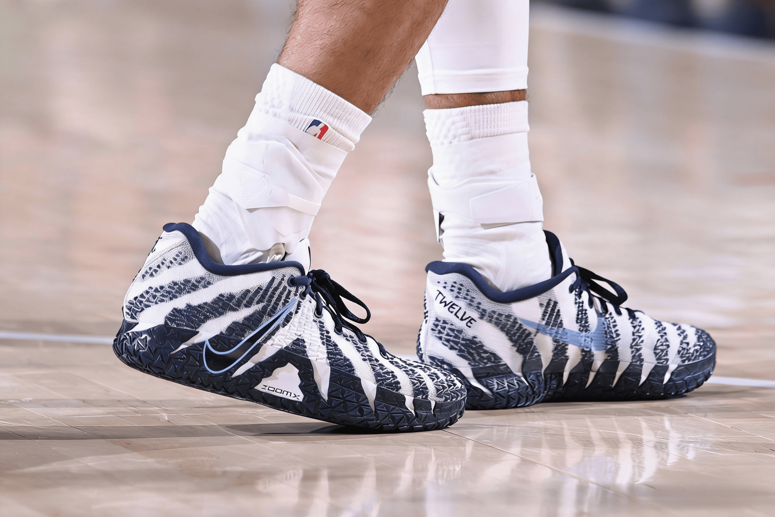 莫兰特穿着白蓝色JA3,得到12分3篮板4助攻1抢断1盖帽