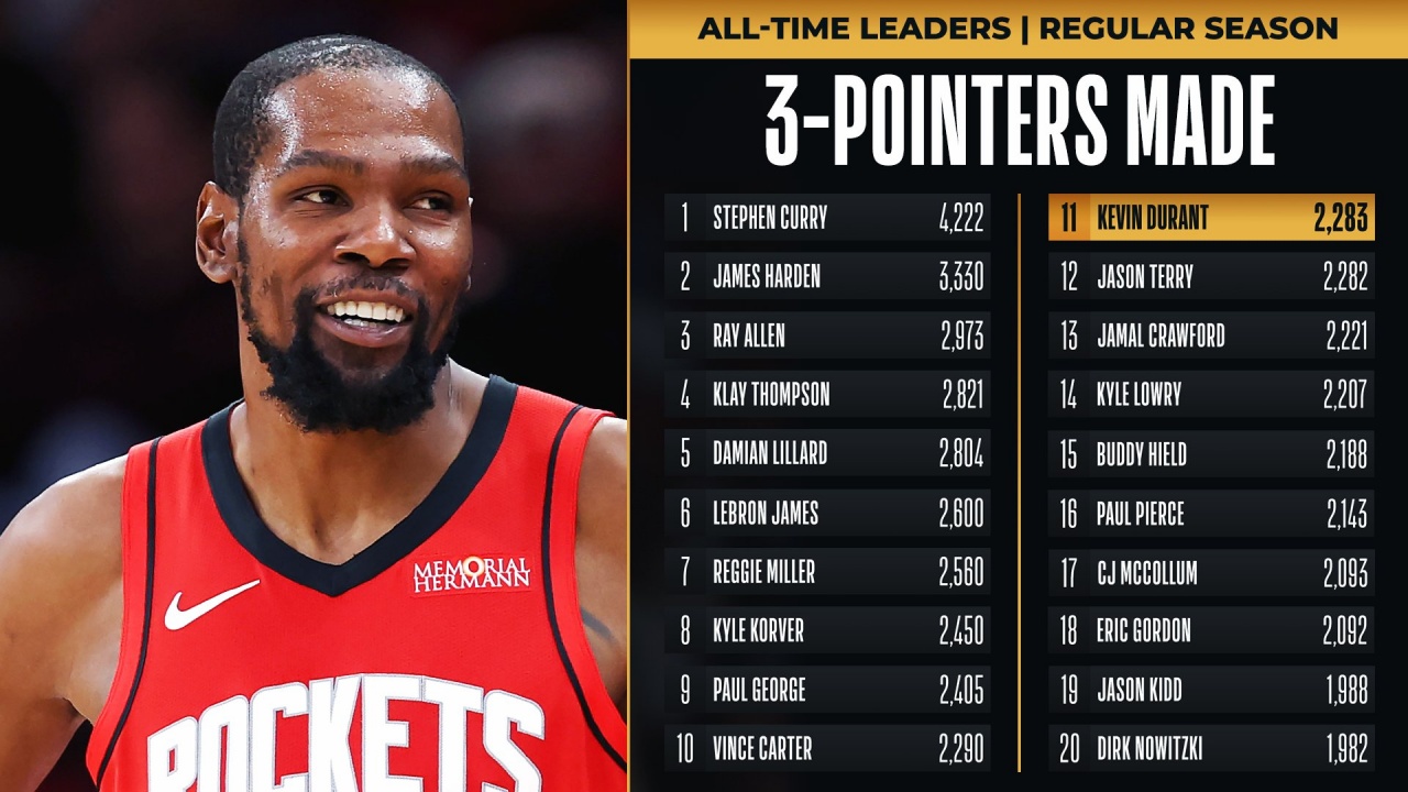 杜兰特生涯投进三分数超越杰森-特里,升至历史第11位