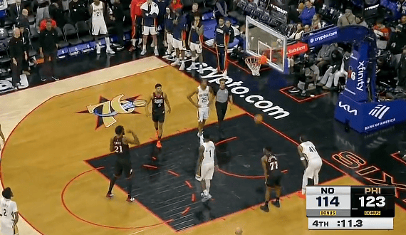 乌布雷攻守转换上篮打进2+1,76人领先鹈鹕到13分