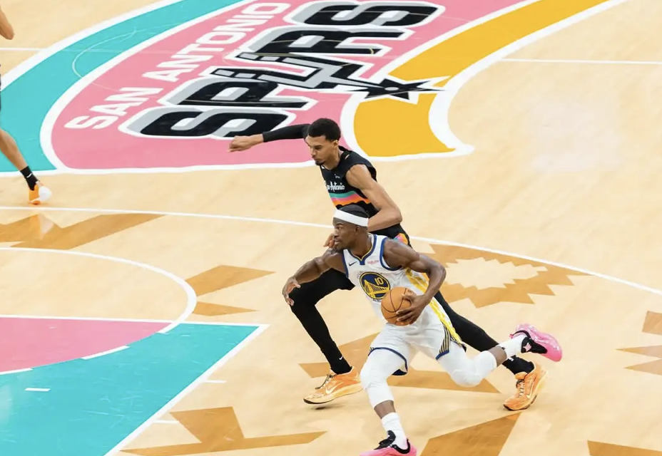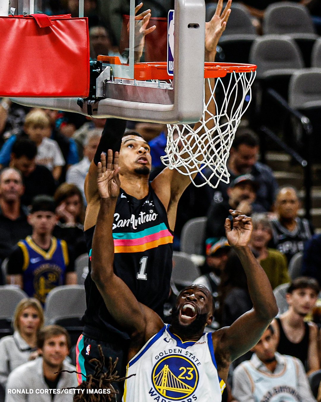 NBA官方分享赛场照:文班亚马跃过了198cm的德雷蒙德-格林