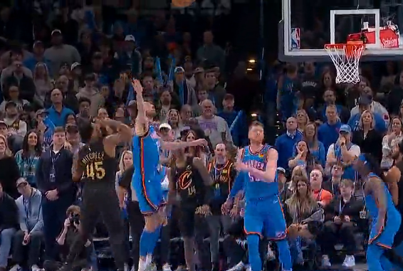 中场前米切尔急停抛投出手,再次完成压哨命中