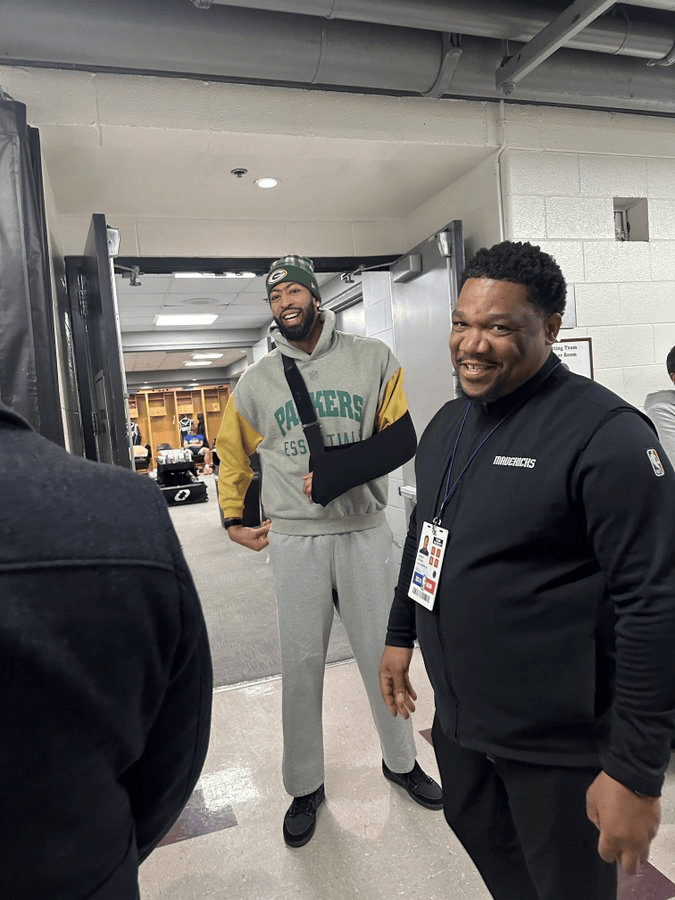 心情不错!戴维斯手戴护具,身穿包装工上衣来到公牛主场