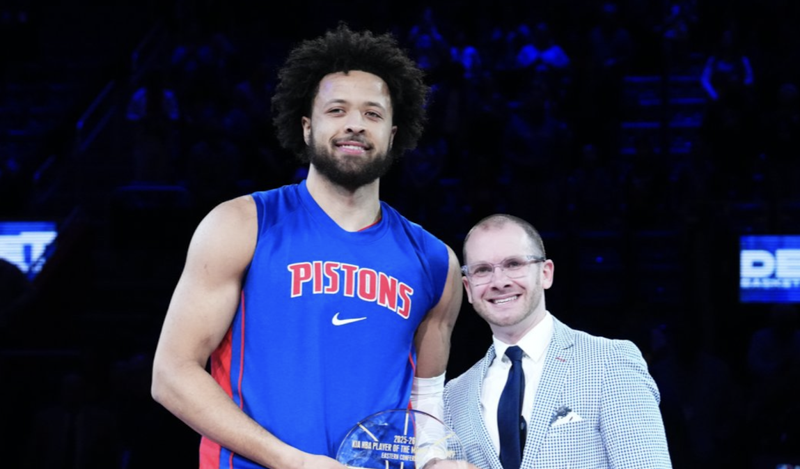实至名归!活塞官媒晒凯德-坎宁安赛前领取东部月最佳奖杯照