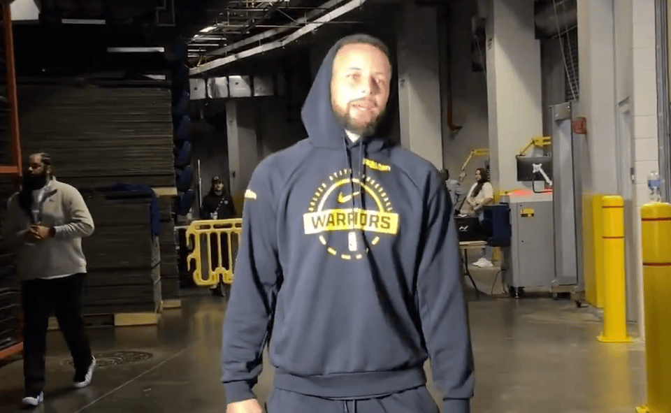 库里身穿勇士训练服步入比赛场馆,表情轻松
