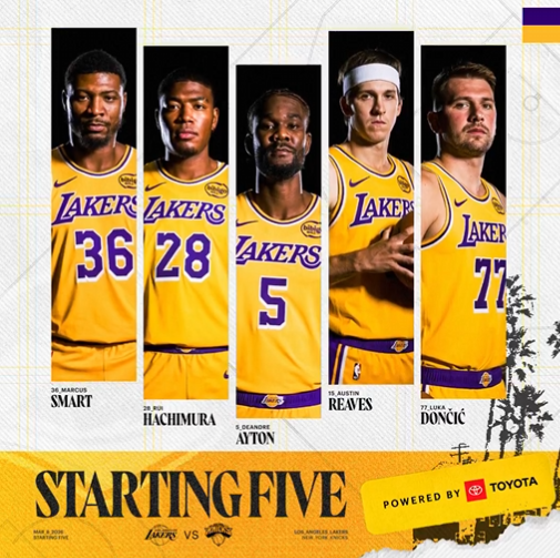 湖人首发:东契奇、斯马特、里夫斯、八村垒、艾顿。
