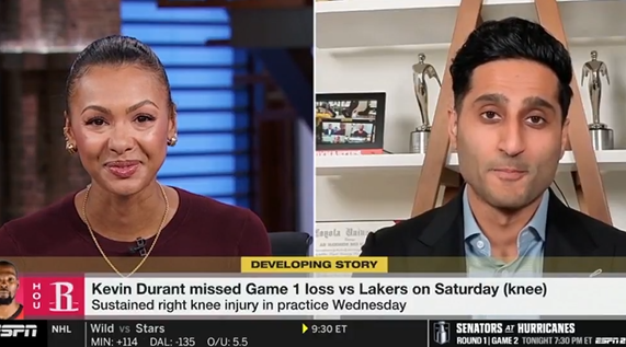 Shams:杜兰特右膝髌腱处有严重的挫伤,G2能否出战尚不确定