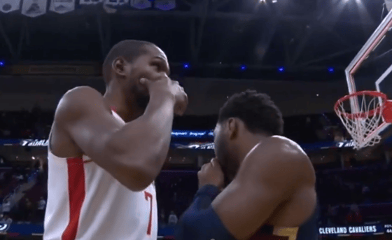 聊啥呢?赛后镜头捕捉到杜兰特与米切尔捂嘴交谈