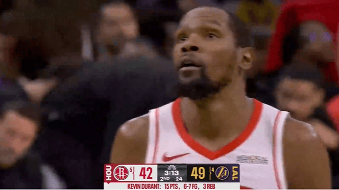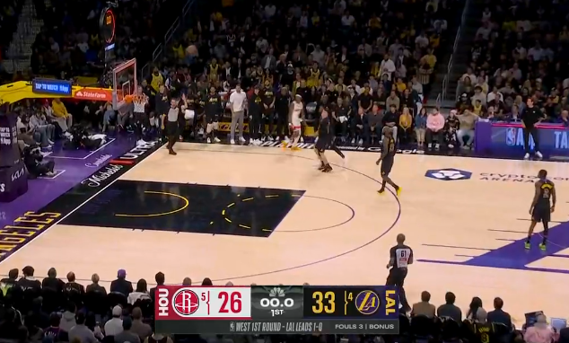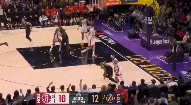 哈登迎着两人包夹压哨三分命中,目前7中6得到全场最高16分