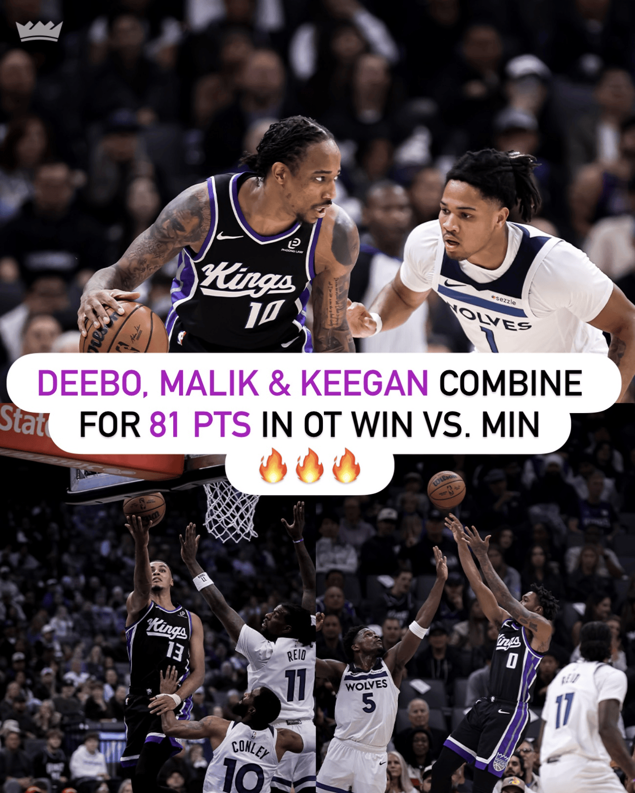 国王官方:德罗赞、蒙克和默里三人合砍81分,战胜森林狼
