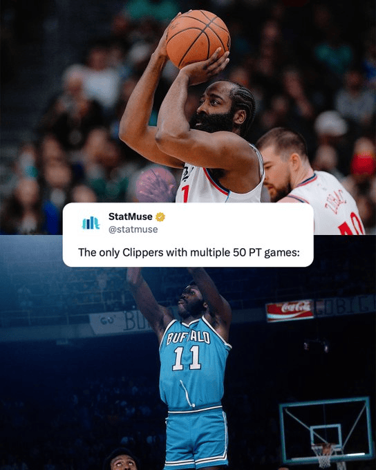 哈登今日55分仅2次失误,为其生涯25次单场50+中最少失误数
