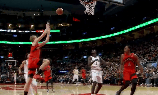伦纳德高低位传球,助攻祖巴茨篮下转身勾手打进