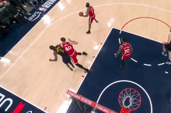 八村垒低位连续背身强攻哈登,被哈登从身后掏球完成抢断