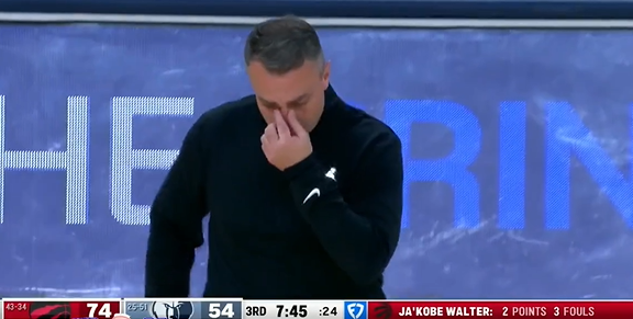 末节申京投三分后乌度卡非常生气,说道:你给我滚回板凳去