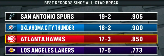 全明星后战绩榜:马刺20-2、雷霆18-2、老鹰18-3、湖人17-5