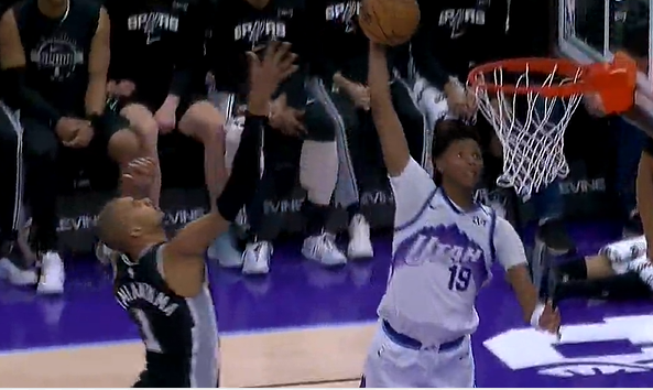 埃斯-贝利接乔治助攻反击起飞,迎着文班的长臂完成单臂砸扣