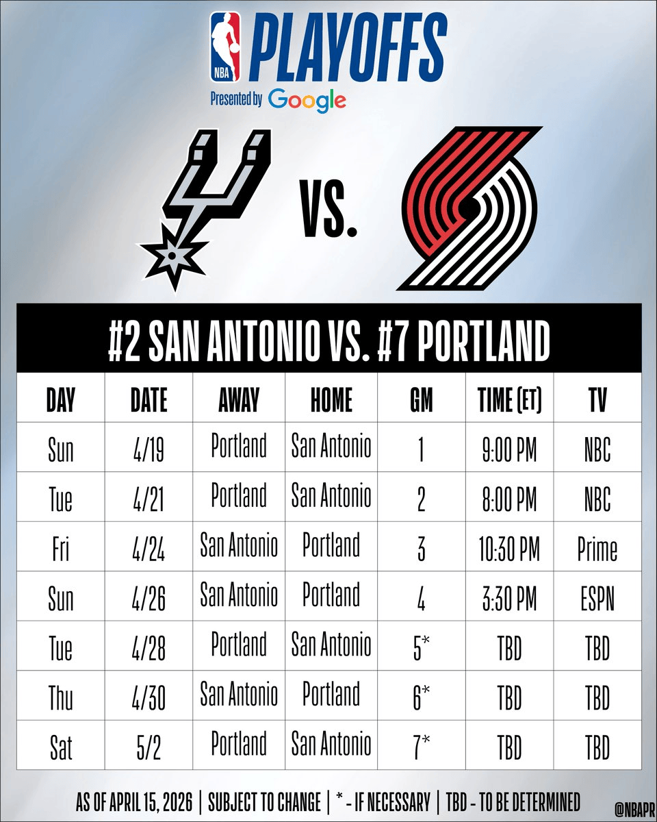 马刺vs开拓者首轮赛程:首战20日早9点,次战22日早8点