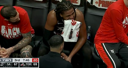 博伊尔斯手腕意外受伤,在替补席咬着毛巾接受治疗