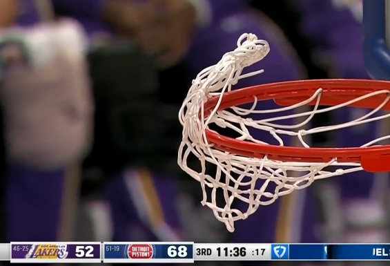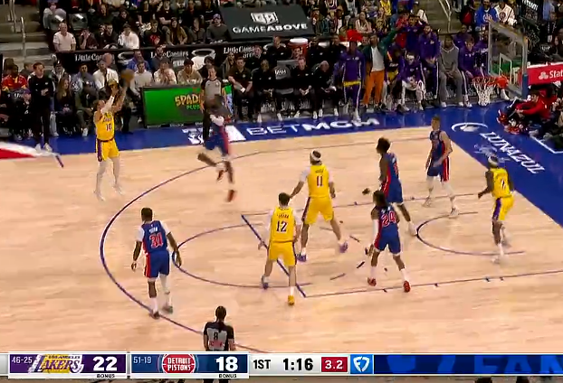 肯纳德造成邓罗三分犯规,三罚全中后湖人还剩2分半追平活塞