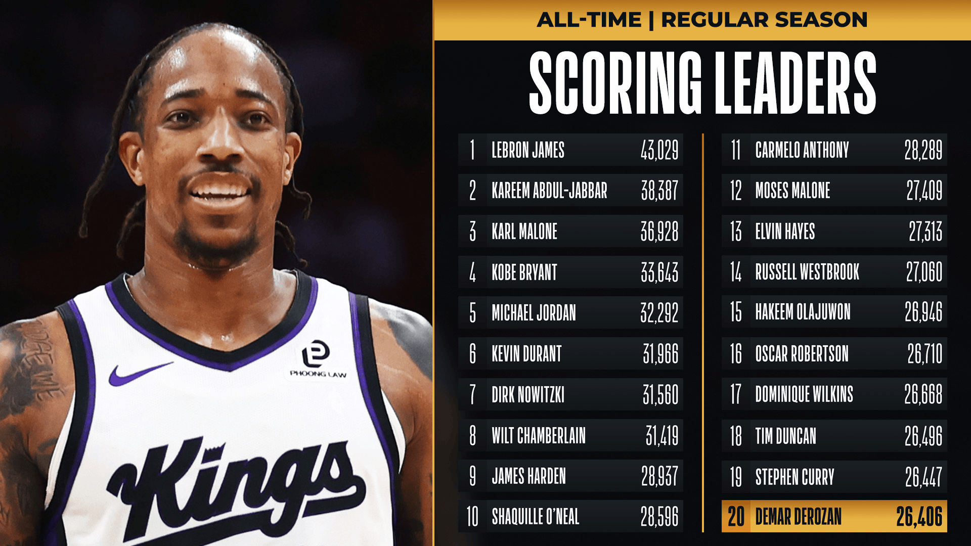 NBA官方:德罗赞生涯26406分,超越皮尔斯独居得分榜第20位