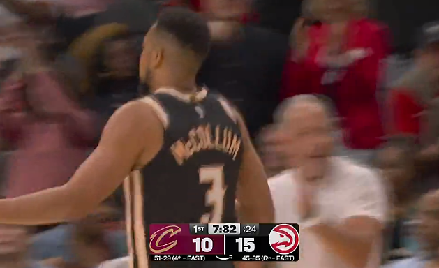 詹姆斯顶着防守高难度翻身三分再中,目前三分3中3拿到15分