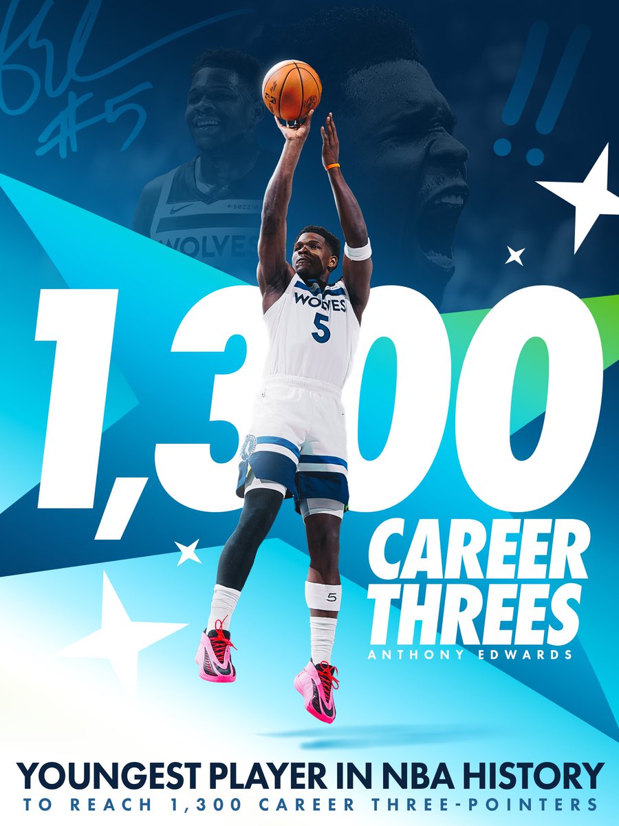 爱德华兹成为历史上三分球命中数突破1300记最年轻的球员
