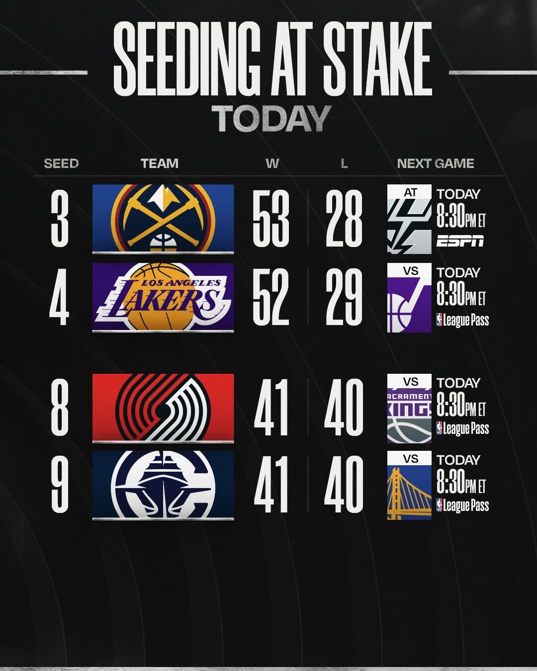 NBA官方:西部排名争夺,湖人掘金争第三,开拓者快船抢第八