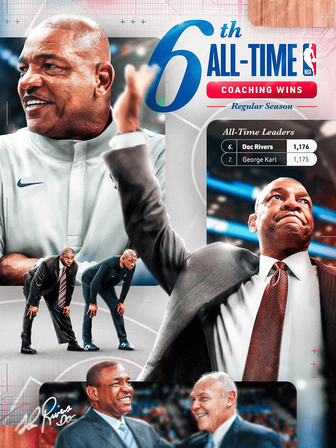 雄鹿官方:祝贺里弗斯教练1176场胜利升至历史教练榜第六
