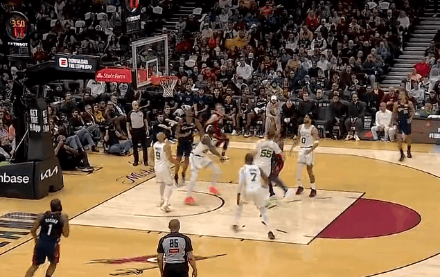 唐斯出手抬肘将克勒贝尔鼻子打出血,裁判吹罚防守犯规