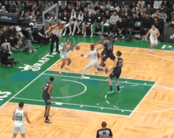 祖巴茨背打吸引防守分球,巴图姆弧顶三分命中追到1分