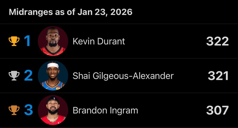 本赛季中距离投篮命中榜:杜兰特亚历山大英格拉姆前三