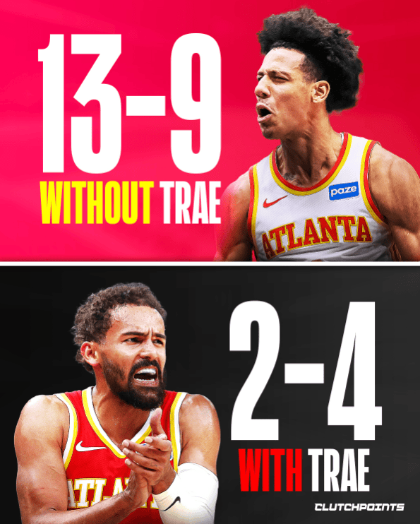 老鹰目前15胜14负,无特雷-杨13胜9负、有特雷-杨2胜4负