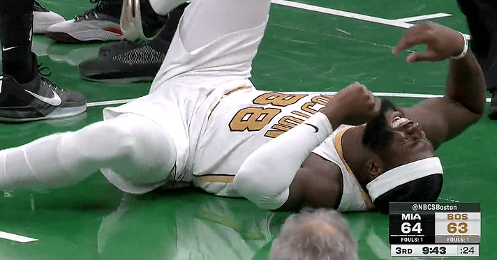 奎塔被鲍威尔撞到导致重心不稳,重重地摔到地板上疼痛不已