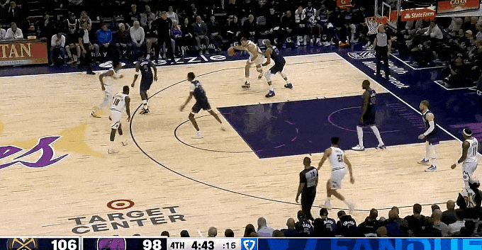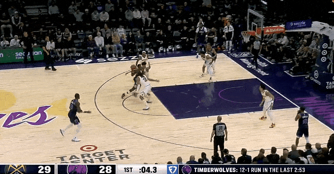 纳兹-里德底角压哨三分投进,森林狼轰出15-1反超掘金2分