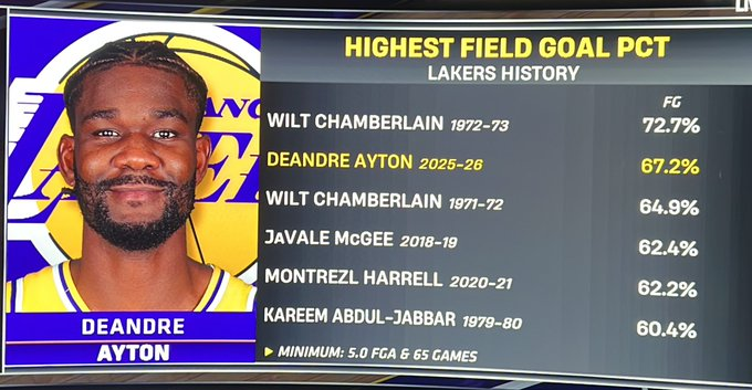艾顿本赛季5次单场80%命中率砍下20+,湖人队史单赛季第三多