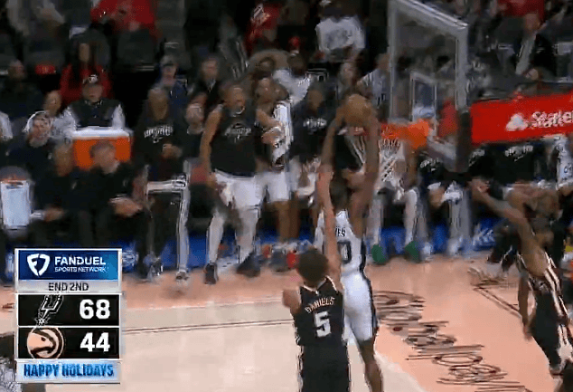巴恩斯抢断反击双手滑翔飞扣,马刺上半场68-44领先老鹰