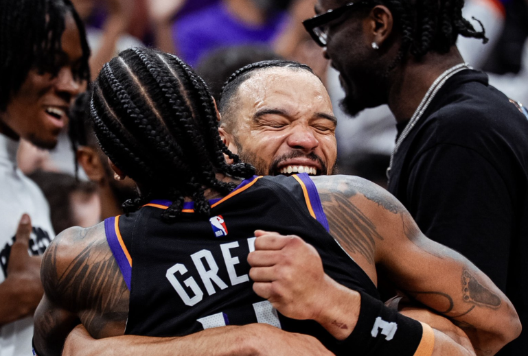 复仇勇士!太阳官方晒格林与狄龙拥抱庆祝照:默契十足