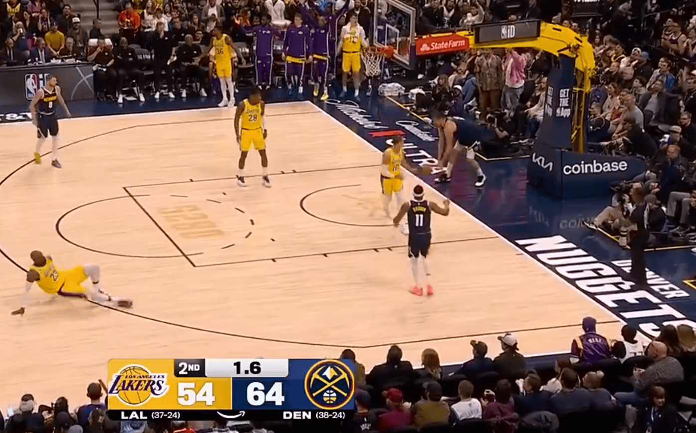 拉拉维亚自抛自接补篮打进,湖人还剩8秒落后掘金5分