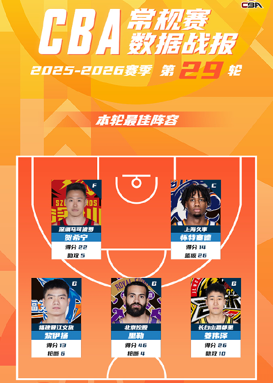 CBA常规赛第29轮最佳阵容:贺希宁、怀特塞德、姜伟泽入选