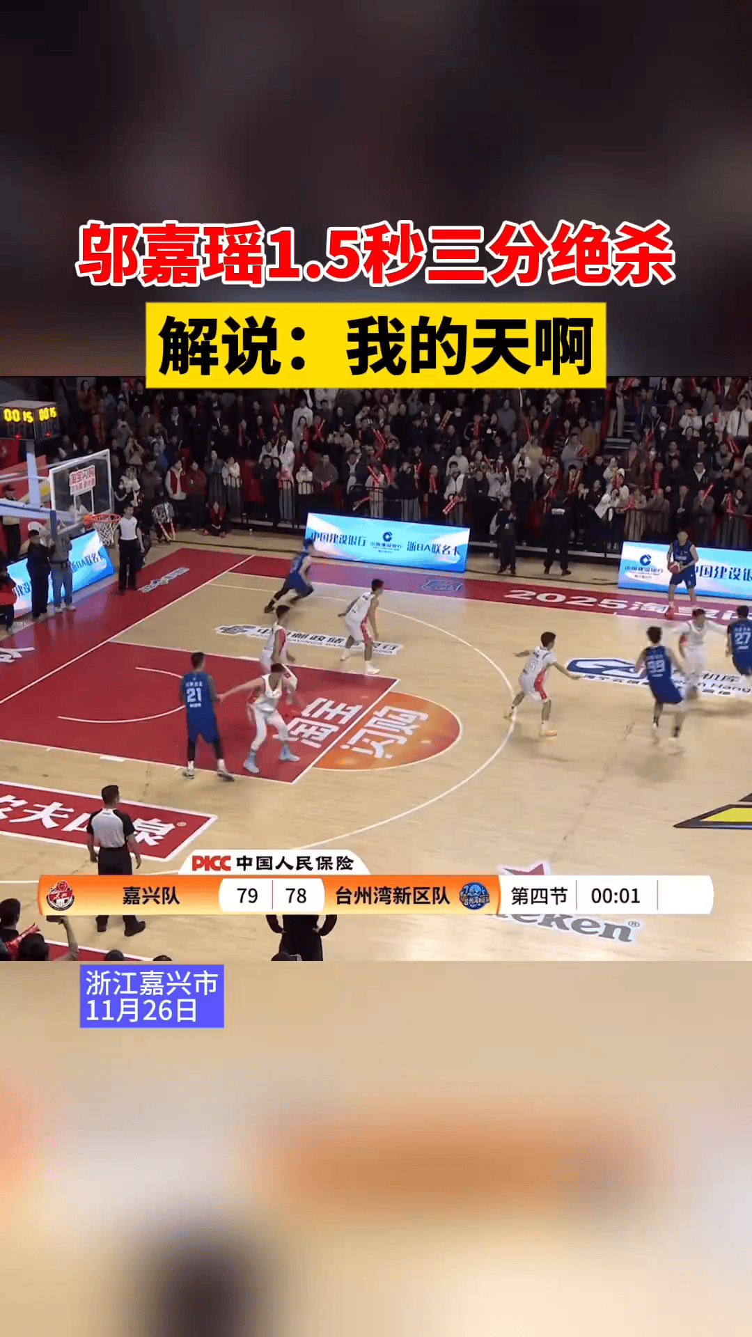 浙BA城市争霸赛,台州湾新区邬嘉瑶3分绝杀带队胜嘉兴
