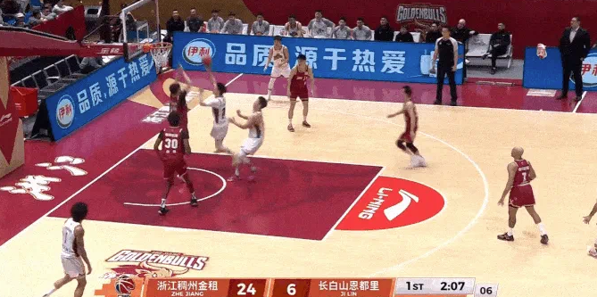 胡金秋外线三分张手命中,个人目前得到10分4篮板